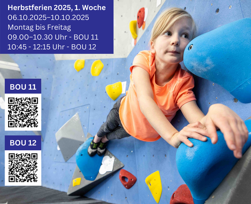 Zum Boulderluft schnuppern für alle, die es mal testen möchten. Ihr habt eine Stunde Zeit, mit einem unserer Trainer die Boulderhalle kennen zu lernen und zu schauen, ob ihr Spass habt und gerne regelmässig bouldern möchtet. Neben einem Sturztraining und einigen hilfreichen Tipps, wie man den Startgriff findet und wo die Boulder enden, könnt Ihr die ersten Boulder erklimmen. Kindern lernen die ersten wichtigen Regeln die es beim Bouldern zu beachetn gibt. Was es bei uns in der Halle alles so zu entdecken gibt, welche Gefahren sie achten müssen und wie man natürlich ganz viel Spass haben kann.